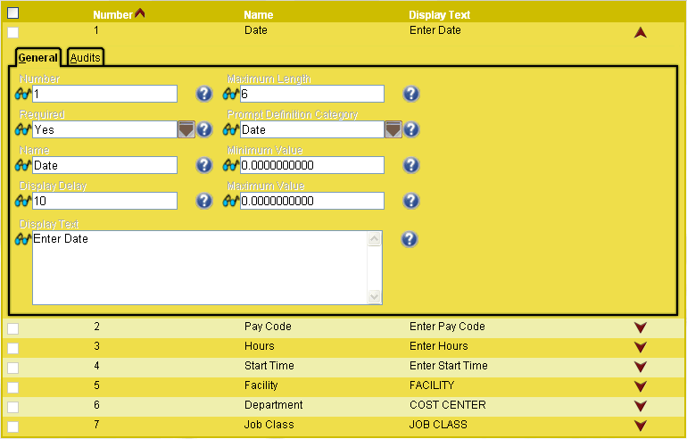 The value found in this field is used to determine the data which the prompt is requesting, such as Date, Hours, Pay Code, or Course. The valid values for this field are displayed in the drop down menu.