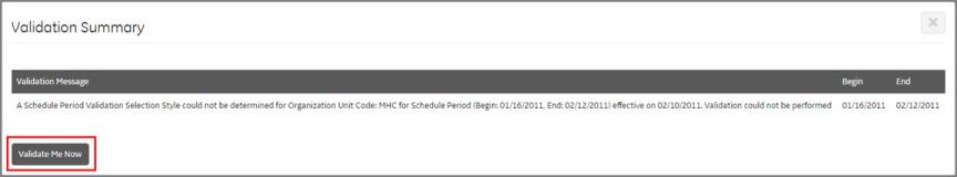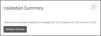 Schedulers have access to the Validate Me Now button. After making changes on the Monthly View screen, the employee validation process determines if any minimum staffing rules are violated. However, instead of waiting for the next instance of the process to run (approximately every five minutes), you can force the validation to occur immediately by clicking Validate Me Now.