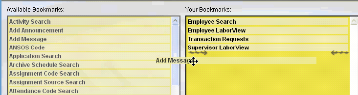 The left column displays all the Available Bookmarks in the system and the right column shows the selected Your Bookmarks.