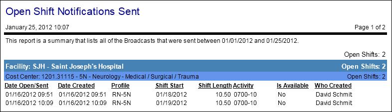 This report shows a summary of all the broadcasts (open shift notifications) that were sent during the specified date range.