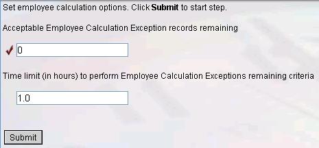 When part of a Time and Attendance Close: This step is meant to allow the user to make sure there are not too many employee calculation requests pending before they continue with the job. The user has the option to enter two preferences: