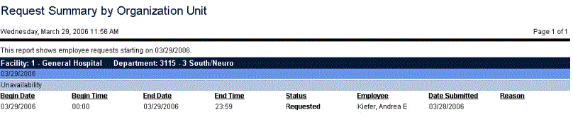 The Request Summary By Organization Unit lists of all of the following that occur in the pay period being processed and are marked as requested, waiting review, or pending review: