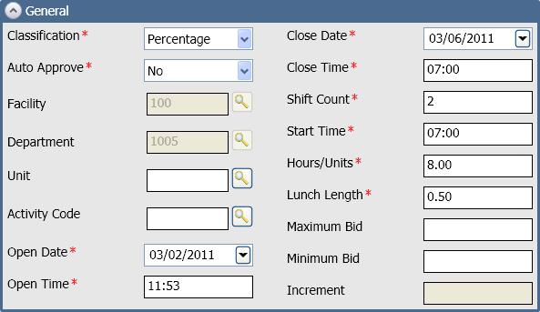 If needed, enter or update the Open Date, Open Time, Close Date, and Close Time.