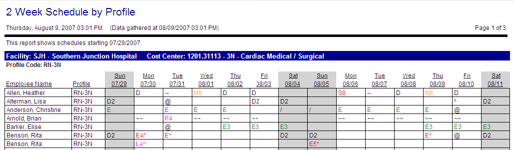 This report shows the schedules of the selected employee types for a two-week date range. The report is sorted by labor distribution and then by profile code. The report shows the employee names and profiles. For each day of the two-week schedule, the employees' scheduled activities are displayed. Parameter options determine the information displayed in the grid, such as activity code, times, productive/non-productive activities, and classes.