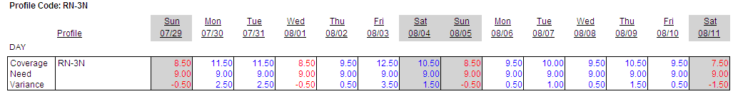 Whether to display the coverage, the need and/or the variance for each profile. If one or more of these parameters is set to Yes but there is no data relating to that parameter, you may receive a message on the report alerting you to this situation. For example, if there are only schedules that do not count toward coverage, such as Off or Vacation, and Yes is selected for the coverage parameter, you will receive a message, "There is no coverage currently applied for the (xx) profile".