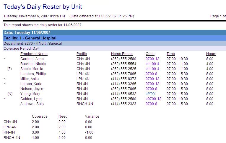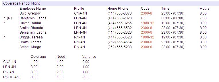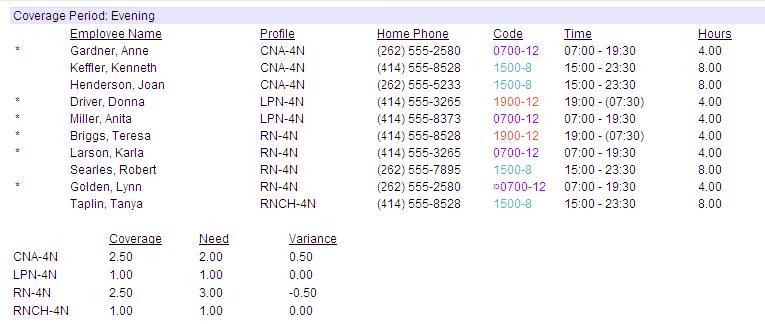 For example, if this report is run for a schedule group, each organization unit in the schedule group would have a page listing all employees scheduled to work during the day shift, evening shift and night shift.