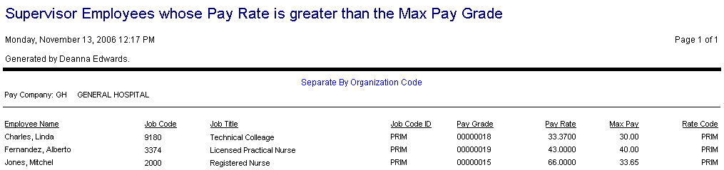 This report lists employees whose pay rate exceeds the maximum defined by their job class and pay grade range.