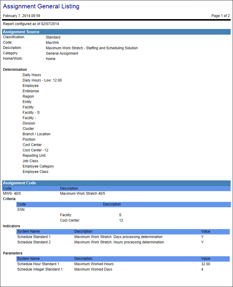If the Show Detail parameter is set to Yes, the report also includes additional details about the assignment source, including the Calculation Rules, Calculation indicators, Calculation Exceptions. The details for the assignment code includes the selection criteria, the indicators, parameters and special codes assigned to this assignment.