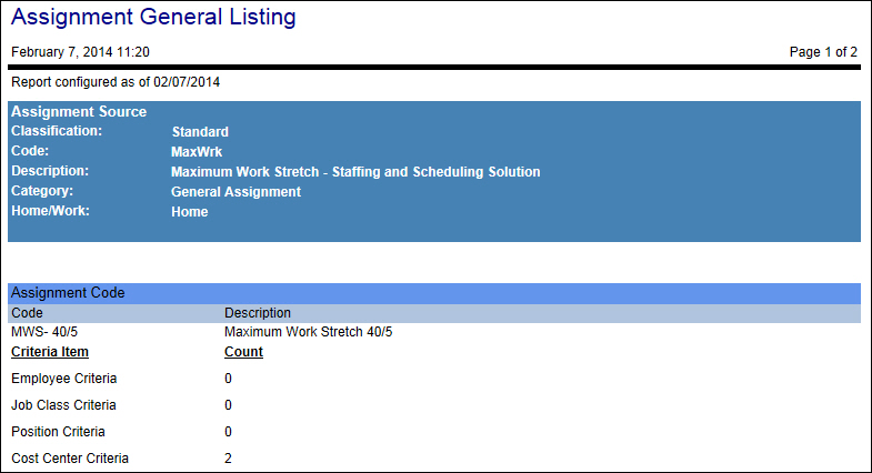 This report lists the assignment codes that meet the entered criteria of Classification, Assignment Source, and Home Distribution. When the Show Details parameter is set to Yes, additional details about both the Assignment Source and the Assignment Code are displayed.