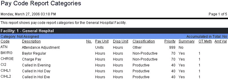 The report fields include the pay code, description, pay code number, category number, Labor View category, pay unit (type), display unit, classification, display priority, summary, overtime accumulation method, and amount value.