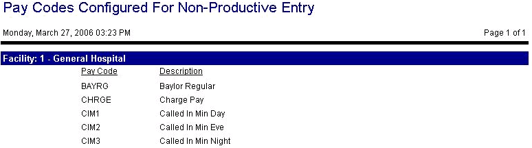 This report lists the pay codes for the specified organization unit that are set up to be nonproductive codes. These are pay codes with the Schedule Standard Indicator 5 set to N for Non-Productive.