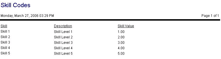 This report lists the skill codes in the system. The fields include the skill code, the description and the numeric skill value.
